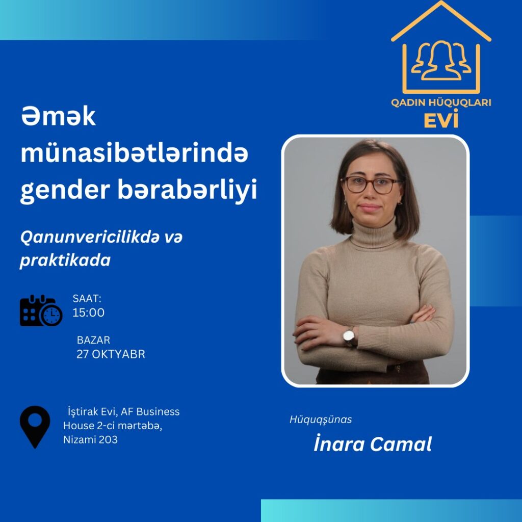 27 oktyabr saat 15:00-da hüquqşünas İnara Camal Azərbaycan qanunvericiliyinə əsasən əmək münasibətlərində gender bərabərliyinin qorunması, bu sahədə olan boşluqlar, təcrübələr haqqında danışacaq.
